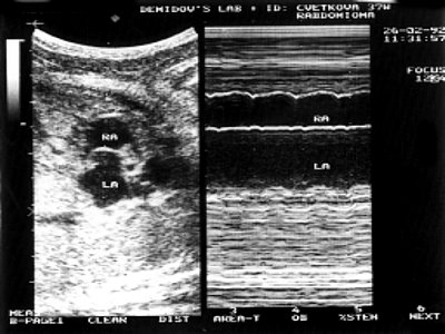 Рис. 2. В и М-сканирование на уровне межпредсердной перегородки, демонстрирующее отсутствие сообщения между предсердиями.