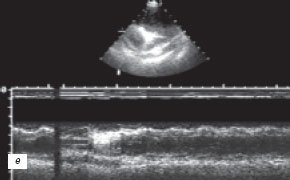 При ЭХОКГ исследовании (рис. 4е) выявлено утолщение до 8 мм и уплотнение листков перикарда, отсутствие эхонегативного пространства за задней стенкой левого желудочка и за передней стенкой правого желудочка, параллельное переднезаднее движение листков перикарда, диффузный гипокинез межжелудочковой перегородки, дискинез межжелудочковой перегородки, диффузный гипокинез задней стенки левого желудочка, значительное снижение систолической функции миокарда левого и правого желудочков: фракция выброса (ФВ) ЛЖ = 39%, фракция укорочения (ФУ) ЛЖ = 19, ФВ ПЖ = 35, ФУ ПЖ = 17%. Диастолическую функцию левого желудочка оценить не представлялось возможным из-за выраженной тахикардии. При доплерографии выявлено снижение раннего митрального потока в начале вдоха, замедление времени изоволюмического расслабленния, а также уменьшение раннего трехстворчатого потока с началом выдоха. Отсутствие изменения диаметра нижней полой вены во время вдоха, регургитирующие потоки в нижней полой вене и печеночных венах свидетельствовали о развитии легочной гипертензии (систолическое давление в легочной артерии равно 84 мм рт. ст.).