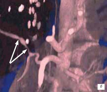 Стеноз печеночной артерии в раннем посттрансплантационном периоде диагностирован у 1 (1,4 %) пациента, а в позднем посттрансплантационном периоде еще у 1 (1,4 %) пациентки. В первом наблюдении в качестве критериев стеноза печеночной артерии использовали снижение РИ < 0,5 и увеличение ВА > 0,08 с [13]. Во втором наблюдении стеноз печеночной артерии был диагностирован на основании локального увеличения скорости кровотока в печеночной артерии > 2 м/с и снижения РИ < 0,5 дистальнее места стеноза (рис. 5 а). В обоих случаях данные УЗИ были подтверждены при проведении спиральной КТ (рис. 5 б).