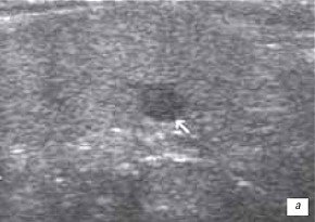 а) В-режим. Гипоэхогенное образование в диаметре до 1,5 см, неоднородное по эхоструктуре, с нечеткими контурами, отсутствие анэхогенного ободка (стрелка).