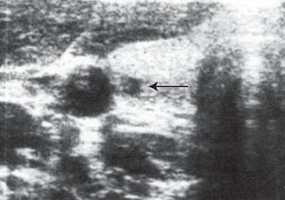После проведения первого курса лечения кисты щитовидной железы с использованием медицинского озона наблюдалась "бахромистость" оболочки кисты и заполнение последней от периферии к центру с одновременным прорастанием прямолинейных сосудов (рис. 1).