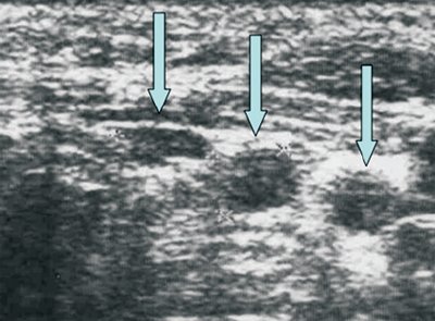 Достаточно характерная ультразвуковая картина лимфатических узлов наблюдается при лимфогранулематозе. При этом в большинстве случаев видно несколько увеличенных лимфатических узлов (одна или несколько групп лимфатических узлов). Узел имеет овальную или округлую форму, четко видимую капсулу, гомогенную, чаще слабо гипоэхогенную структуру. Группа увеличенных лимфатических узлов ("пачка") представлена четко отграниченными, не прорастающими капсулу и не сливающимися между собой лимфатические узлы (как при метастатическом поражении, в виде конгломерата) и может локализоваться в какой-либо одной области (например, надключично справа или слева) или в нескольких областях (увеличенные лимфатические узлы средостения, надключичные и в нижней трети шеи с одной или обеих сторон и др.).