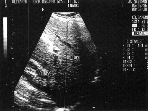 Рис. 4. Эхограмма правой доли печени при ее увеличении: Liver - печень, Kidney - почка.