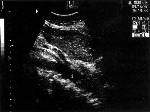 Рис. 46. Эхографическая картина почки с дилатацией лоханки и проксимального отдела мочеточника: 1 - мочевой пузырь, 2 - мочеточник, 3 - почка, 4 - лоханка.