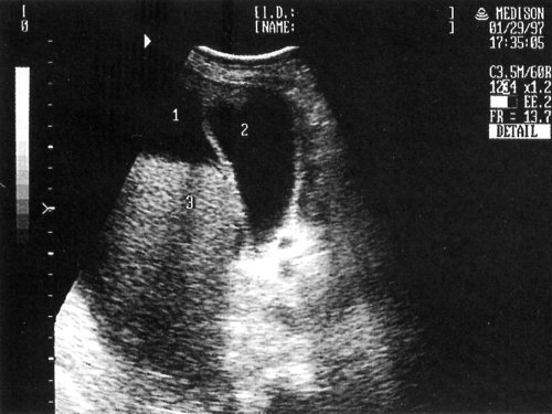 Рис. 28. Эхографическая картина псевдокисты поджелудочной железы: 1 - печень, 2 - желудок, 3 - киста.