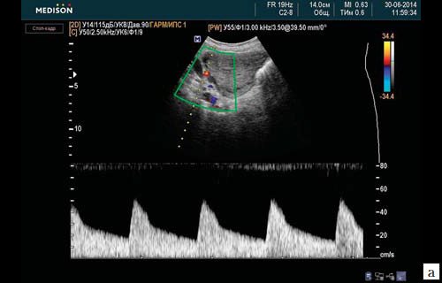 Ультразвуковое исследование проводилось на аппарате с использованием конвексных трансабдоминального и трансвагинального мультичастотных трансдьюсеров, позволяющих проводить дуплексное сканирование в режиме цветового допплеровского картирования (ЦДК). Сканирование проводилось в течение всего послеоперационного периода. Маточные сосуды (a. et v.uterine) сканировали в сагиттальной плоскости, что позволяло оценить индексы сопротивления в артериальных сосудах: индекс резистентности (Ri) и пульсационный индекс (Pi), а также пиковую систолическую скорость (Ps) и конечную диастолическую скорость (Ed); в венах - среднюю линейную скорость потока крови (Vtamx). Трансабдоминальное сканирование в 83,7% случаев позволило адекватно визуализировать изучаемые сосуды. Лишь в 16,3% наблюдений из-за выраженного метеоризма потребовалось использование трансвагинального трансдьюсера.
