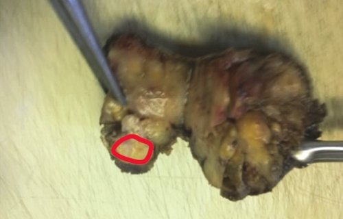 Затем сравнивались данные морфологического исследования с данными гистосканирования. Это сравнение выполнялось совместно со специалистами-морфологами после выполнения радикальной простатэктомии. Здесь необходимо отметить, что существует несколько методик послеоперационной оценки предстательной железы. Мы использовали следующую методику: во-первых, вся простата нарезалась морфологом как "раскрытая книга": разрезы органа производились от основания до верхушки толщиной среза по 2-3 мм и выполнялись не до конца, то есть, если сравнивать с раскрытой книгой, оставалась зона "переплета данной книги". Результаты морфологического исследования полностью подтверждают данные гистосканирования: по гистоскану, узел располагается в правой доле, макроскопически при морфологическом исследовании узел прилегает к капсуле предстательной железы в правой доле (рис. 5).