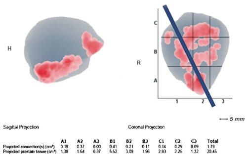 В дальнейшем после биопсии простаты в сотрудничестве со специалистами-морфологами устанавливалось соответствие между расположением опухолевого очага по данным гистосканирования и при морфологическом исследовании биоптатов ткани простаты.
