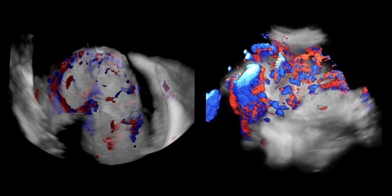 Рис. 1. УЗИ матки при прорастании плаценты (энергетический допплер, слева B-режим, справа - 3D). Визуализируется неравномерная внутриплацентарная васкуляризация с извитыми сливающимися сосудами, пересекающими плаценту по ширине.