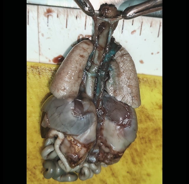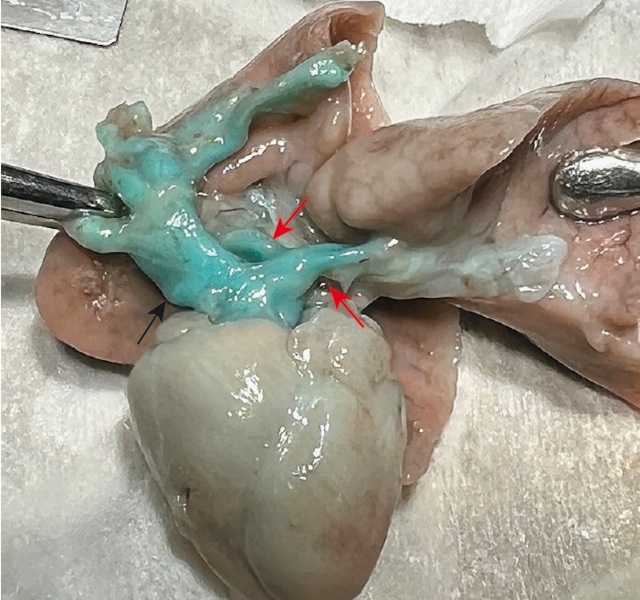 Для лучшей дифференцировки сосудов в процессе аутопсии было решено артериальный ствол и его ветви окрасить синим красителем, введенным в корень сосуда с помощью тонкой иглы, затем органокомплекс фиксировать в формалине в течение 3 дней (рис. 10в), после этого сосуды было легче выделить и убедиться, что это действительно БАЛКА.
