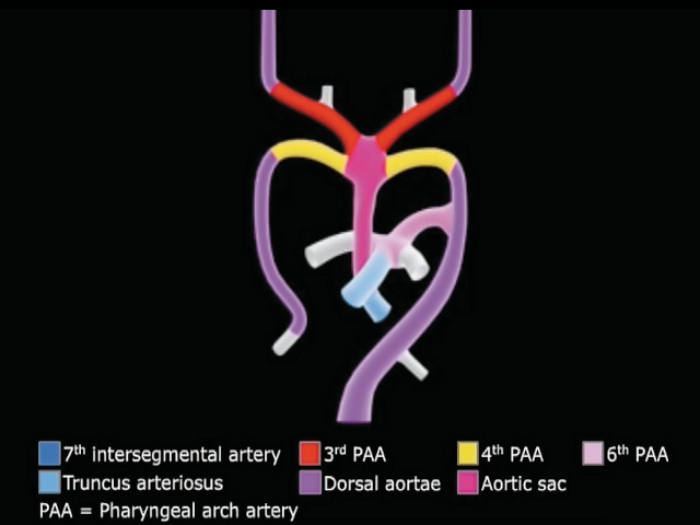 б) соответствующими цветами окрашены части уже сформированной аорты, ее ветвей, легочного ствола, легочных артерий и боталлова протока.