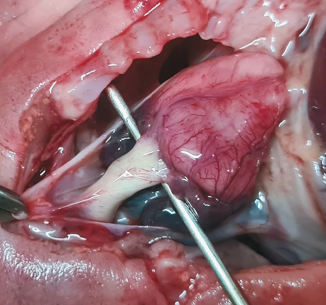 Довольно сложно идентифицировать боталлов проток - он может отсутствовать в 50% случаев как при ОАС, так и при АЛА. Помогает диагностическому процессу его расположение в типичном месте - в области перешейка. Если при нормальной анатомии он соединяется с легочной артерией, то в случае ее атрезии он идет напрямую в легкие к более мелким сосудам, таким образом, может выглядеть более длинным и иметь извилистый ход (рис. 11а). При аутопсии мы его нашли, растягивая дугу аорты, к этому моменту нечаянно рассекли его, дистальный конец его соединялся легочными ветвями (рис. 11б).