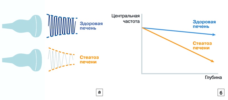 Рис. 1. а) ослабление ультразвукового сигнала в здоровой печени и при стеатозе; б) сдвиг центральной частоты в зависимости от глубины.